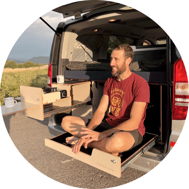 In 2012, I began shaping this project that we now call CAMPERLAND. I began testing different materials, experimenting with various furniture designs, and constantly evolving until today, where we design and manufacture self-installable modules for camper van conversions.