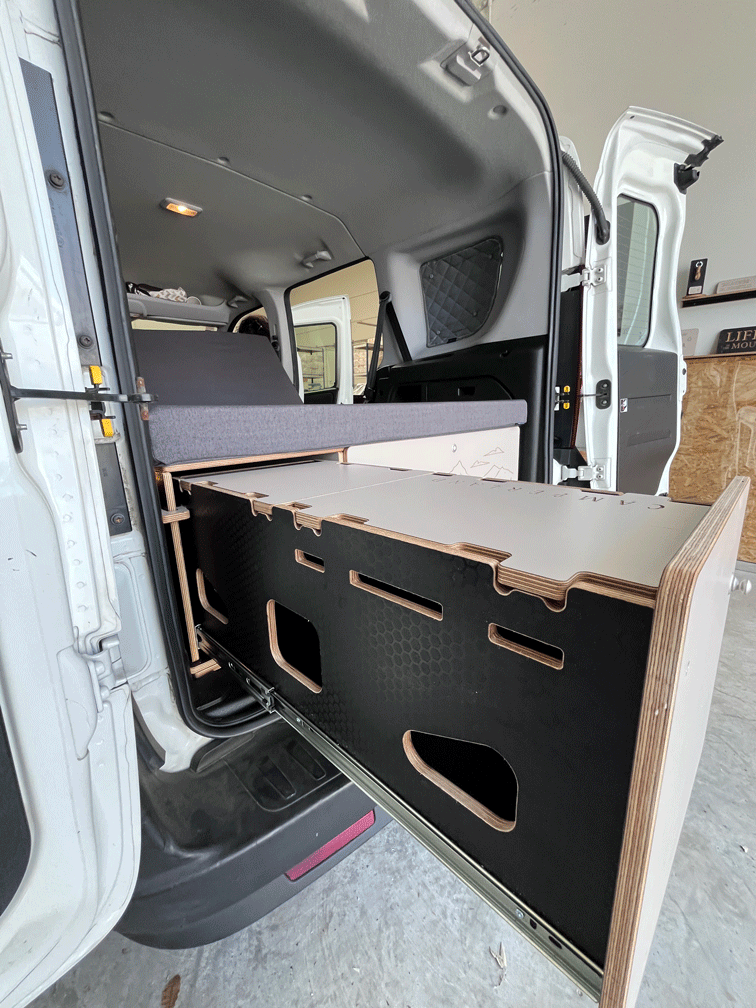 - Right storage drawer with front door, top lid, and rear access